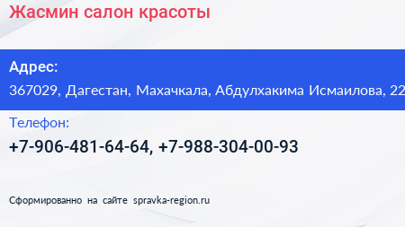Жасмин, салон красоты по адресу 367029, Дагестан, Махачкала, Абдулхакима Исмаилова, 22 в дальнейшем Организация, размещена в следующих категориях: