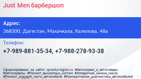 Just Men, барбершоп по адресу 368300, Дагестан, Махачкала, Халилова, 48а в дальнейшем Организация, размещена в следующих категориях: