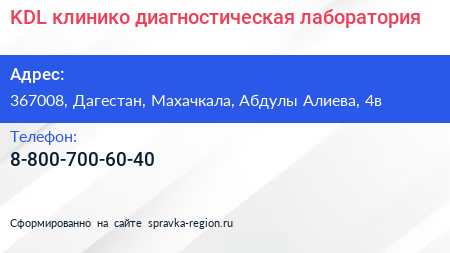 KDL, клинико-диагностическая лаборатория по адресу 367008, Дагестан, Махачкала, Абдулы Алиева, 4в в дальнейшем Организация, размещена в следующих категориях: