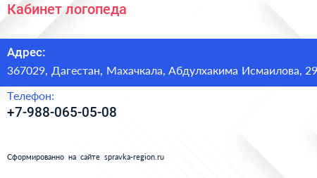 Кабинет логопеда по адресу 367029, Дагестан, Махачкала, Абдулхакима Исмаилова, 29 в дальнейшем Организация, размещена в следующих категориях: