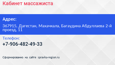 Кабинет массажиста по адресу 367915, Дагестан, Махачкала, Багаудина Абдуллаева 2-й проезд, 11 в дальнейшем Организация, размещена в следующих категориях: