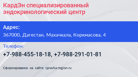 КардЭн, специализированный эндокринологический центр по адресу 367000, Дагестан, Махачкала, Коркмасова, 4 в дальнейшем Организация, размещена в следующих категориях:
