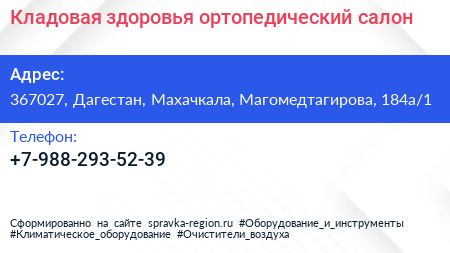 Кладовая здоровья, ортопедический салон по адресу 367027, Дагестан, Махачкала, Магомедтагирова, 184а/1 в дальнейшем Организация, размещена в следующих категориях: