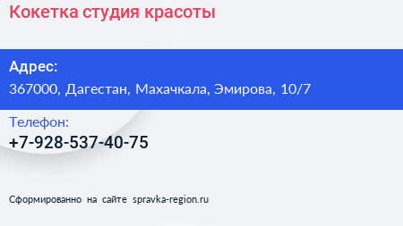 Кокетка, студия красоты по адресу 367000, Дагестан, Махачкала, Эмирова, 10/7 в дальнейшем Организация, размещена в следующих категориях: