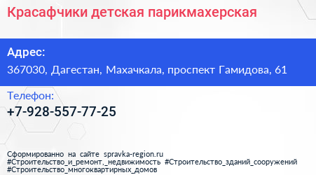 Красафчики, детская парикмахерская по адресу 367030, Дагестан, Махачкала, проспект Гамидова, 61 в дальнейшем Организация, размещена в следующих категориях:
