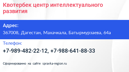 Квотербек, центр интеллектуального развития по адресу 367008, Дагестан, Махачкала, Батырмурзаева, 64а в дальнейшем Организация, размещена в следующих категориях: