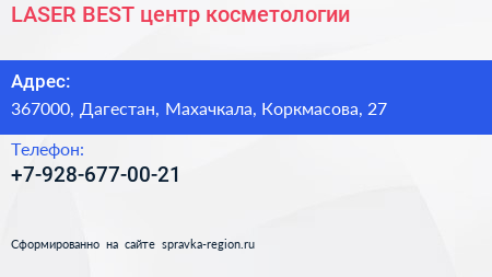 LASER BEST, центр косметологии по адресу 367000, Дагестан, Махачкала, Коркмасова, 27 в дальнейшем Организация, размещена в следующих категориях: