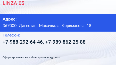 LINZA 05 по адресу 367000, Дагестан, Махачкала, Коркмасова, 18 в дальнейшем Организация, размещена в следующих категориях: