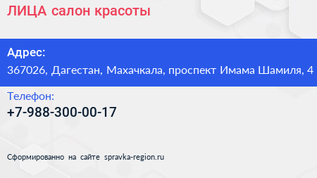 ЛИЦА, салон красоты по адресу 367026, Дагестан, Махачкала, проспект Имама Шамиля, 4 в дальнейшем Организация, размещена в следующих категориях: