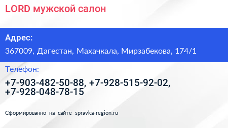 LORD, мужской салон по адресу 367009, Дагестан, Махачкала, Мирзабекова, 174/1 в дальнейшем Организация, размещена в следующих категориях: