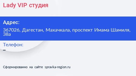 Lady &, VIP-студия по адресу 367026, Дагестан, Махачкала, проспект Имама Шамиля, 38а в дальнейшем Организация, размещена в следующих категориях: