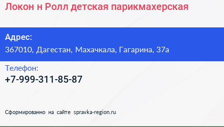 Локон-н-Ролл, детская парикмахерская по адресу 367010, Дагестан, Махачкала, Гагарина, 37а в дальнейшем Организация, размещена в следующих категориях: