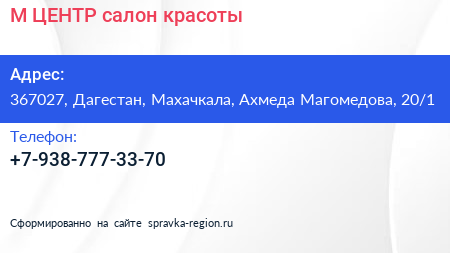 М-ЦЕНТР, салон красоты по адресу 367027, Дагестан, Махачкала, Ахмеда Магомедова, 20/1 в дальнейшем Организация, размещена в следующих категориях: