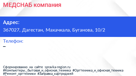 МЕДСНАБ, компания по адресу 367027, Дагестан, Махачкала, Буганова, 10/2 в дальнейшем Организация, размещена в следующих категориях: