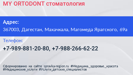 MY ORTODONT, стоматология по адресу 367003, Дагестан, Махачкала, Магомеда Ярагского, 69а в дальнейшем Организация, размещена в следующих категориях: