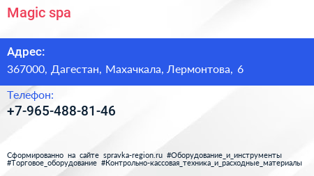 Magic spa по адресу 367000, Дагестан, Махачкала, Лермонтова, 6 в дальнейшем Организация, размещена в следующих категориях: