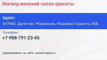 Marang, женский салон красоты по адресу 367000, Дагестан, Махачкала, Максима Горького, 82Б в дальнейшем Организация, размещена в следующих категориях: