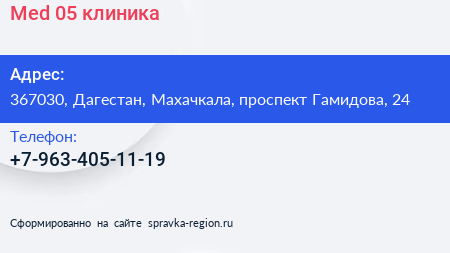 Med-05, клиника по адресу 367030, Дагестан, Махачкала, проспект Гамидова, 24 в дальнейшем Организация, размещена в следующих категориях: