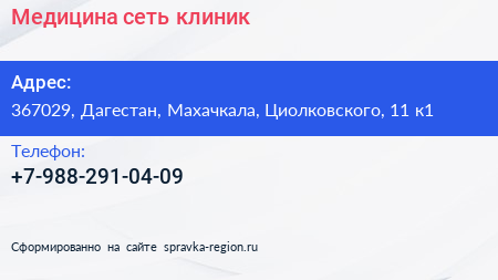 Медицина, сеть клиник по адресу 367029, Дагестан, Махачкала, Циолковского, 11 к1 в дальнейшем Организация, размещена в следующих категориях:
