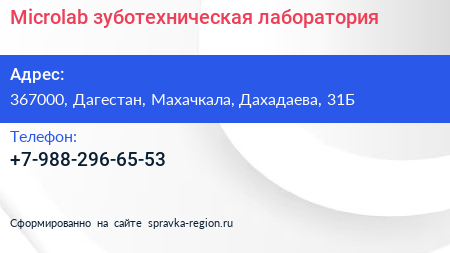 Microlab, зуботехническая лаборатория по адресу 367000, Дагестан, Махачкала, Дахадаева, 31Б в дальнейшем Организация, размещена в следующих категориях:
