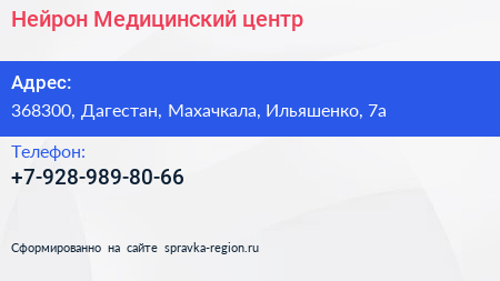 Нейрон, Медицинский центр по адресу 368300, Дагестан, Махачкала, Ильяшенко, 7а в дальнейшем Организация, размещена в следующих категориях:
