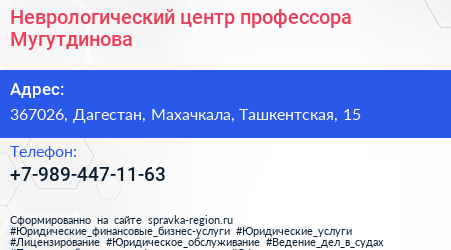 Неврологический центр профессора Мугутдинова по адресу 367026, Дагестан, Махачкала, Ташкентская, 15 в дальнейшем Организация, размещена в следующих категориях: