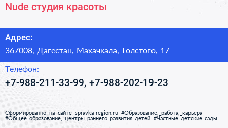 Nude, студия красоты по адресу 367008, Дагестан, Махачкала, Толстого, 17 в дальнейшем Организация, размещена в следующих категориях: