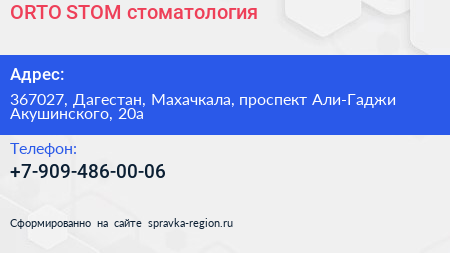 ORTO STOM, стоматология по адресу 367027, Дагестан, Махачкала, проспект Али-Гаджи Акушинского, 20а в дальнейшем Организация, размещена в следующих категориях: