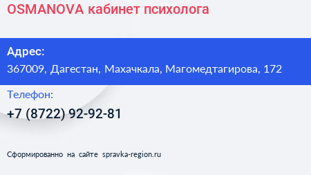 OSMANOVA, кабинет психолога по адресу 367009, Дагестан, Махачкала, Магомедтагирова, 172 в дальнейшем Организация, размещена в следующих категориях: