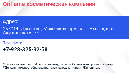 Oriflame, косметическая компания по адресу 367014, Дагестан, Махачкала, проспект Али-Гаджи Акушинского, 74 в дальнейшем Организация, размещена в следующих категориях: