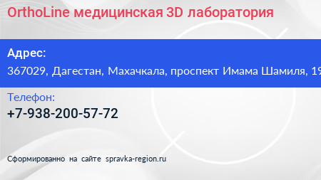 OrthoLine, медицинская 3D лаборатория по адресу 367029, Дагестан, Махачкала, проспект Имама Шамиля, 19 в дальнейшем Организация, размещена в следующих категориях: