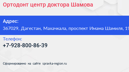 Ортодонт-центр доктора Шамова по адресу 367029, Дагестан, Махачкала, проспект Имама Шамиля, 19 в дальнейшем Организация, размещена в следующих категориях:
