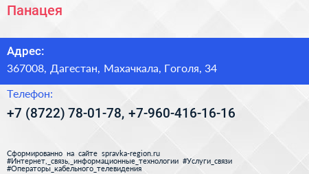 Панацея по адресу 367008, Дагестан, Махачкала, Гоголя, 34 в дальнейшем Организация, размещена в следующих категориях: