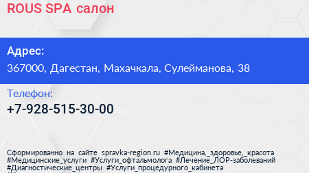 ROUS, SPA-салон по адресу 367000, Дагестан, Махачкала, Сулейманова, 38 в дальнейшем Организация, размещена в следующих категориях:
