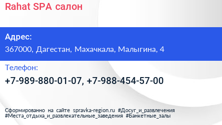 Rahat, SPA-салон по адресу 367000, Дагестан, Махачкала, Малыгина, 4 в дальнейшем Организация, размещена в следующих категориях: