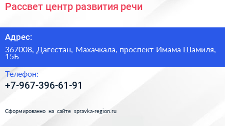 Рассвет, центр развития речи по адресу 367008, Дагестан, Махачкала, проспект Имама Шамиля, 15Б в дальнейшем Организация, размещена в следующих категориях: