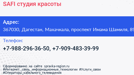 SAFI, студия красоты по адресу 367030, Дагестан, Махачкала, проспект Имама Шамиля, 89 в дальнейшем Организация, размещена в следующих категориях: