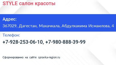 STYLE, салон красоты по адресу 367029, Дагестан, Махачкала, Абдулхакима Исмаилова, 4 в дальнейшем Организация, размещена в следующих категориях:
