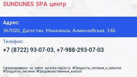 SUNDUNES, SPA-центр по адресу 367020, Дагестан, Махачкала, Аликолобская, 14Б в дальнейшем Организация, размещена в следующих категориях: