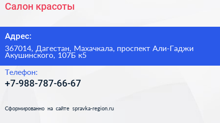 Салон красоты по адресу 367014, Дагестан, Махачкала, проспект Али-Гаджи Акушинского, 107Б к5 в дальнейшем Организация, размещена в следующих категориях: