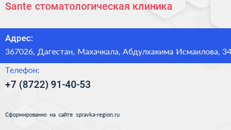 Sante, стоматологическая клиника по адресу 367026, Дагестан, Махачкала, Абдулхакима Исмаилова, 34 в дальнейшем Организация, размещена в следующих категориях: