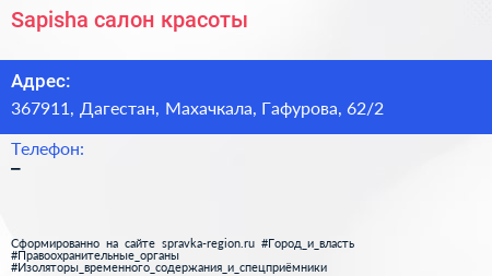 Sapisha, салон красоты по адресу 367911, Дагестан, Махачкала, Гафурова, 62/2 в дальнейшем Организация, размещена в следующих категориях: