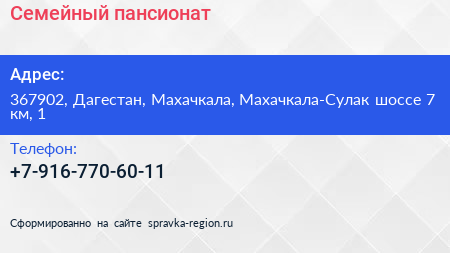 Семейный, пансионат по адресу 367902, Дагестан, Махачкала, Махачкала-Сулак шоссе 7 км, 1 в дальнейшем Организация, размещена в следующих категориях: