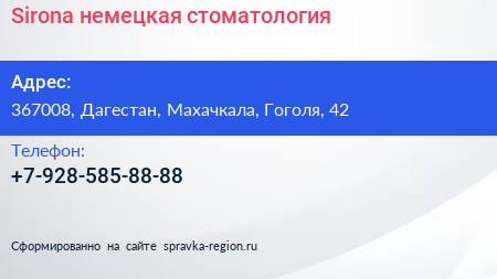 Sirona, немецкая стоматология по адресу 367008, Дагестан, Махачкала, Гоголя, 42 в дальнейшем Организация, размещена в следующих категориях:
