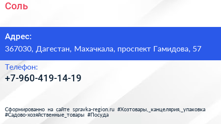 Соль+ по адресу 367030, Дагестан, Махачкала, проспект Гамидова, 57 в дальнейшем Организация, размещена в следующих категориях: