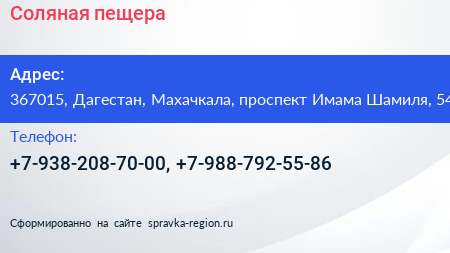Соляная пещера по адресу 367015, Дагестан, Махачкала, проспект Имама Шамиля, 54 в дальнейшем Организация, размещена в следующих категориях: