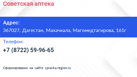 Советская аптека по адресу 367027, Дагестан, Махачкала, Магомедтагирова, 161г в дальнейшем Организация, размещена в следующих категориях: