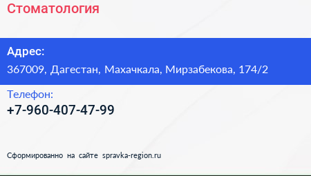 Стоматология по адресу 367009, Дагестан, Махачкала, Мирзабекова, 174/2 в дальнейшем Организация, размещена в следующих категориях: