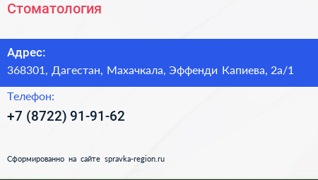 Стоматология по адресу 368301, Дагестан, Махачкала, Эффенди Капиева, 2а/1 в дальнейшем Организация, размещена в следующих категориях: