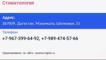 Стоматология по адресу 367009, Дагестан, Махачкала, Шелковая, 15 в дальнейшем Организация, размещена в следующих категориях:
